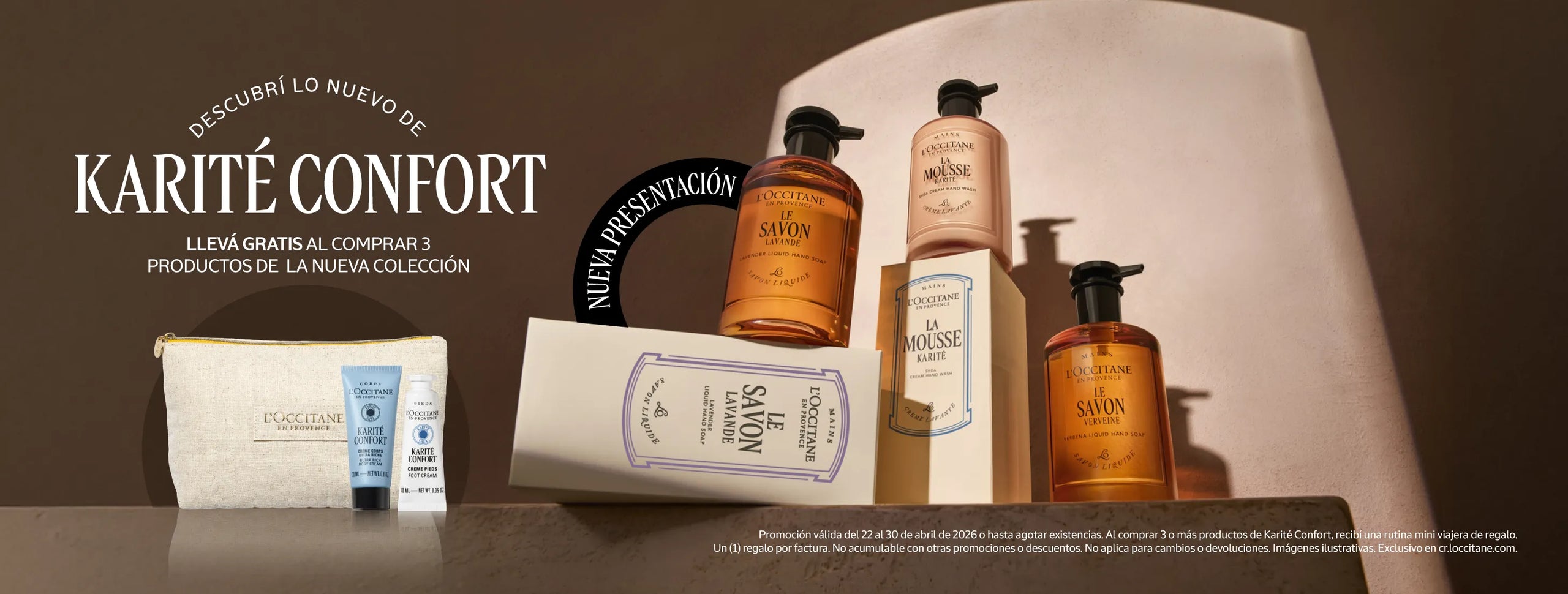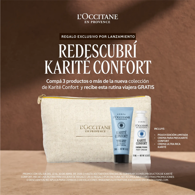 Aplica en mercancía regular. Válido del 2 al 30 de abril de 2026 o hasta agotar 28 unidades limitadas. No aplica con otras promociones, kits, ni descuentos. No aplica con la colección Karité Confort. Regalo no acumulable. Una promoción por factura.