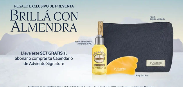 Lleva este Set con Aceite de Ducha de Almendra de 30ml, gua sha corporal y pouch, GRATIS al comprar o abonar tu Calendario de Adviento Signature.